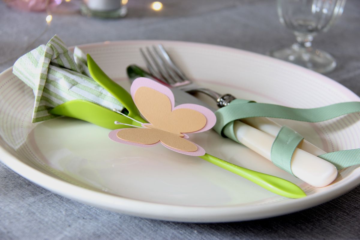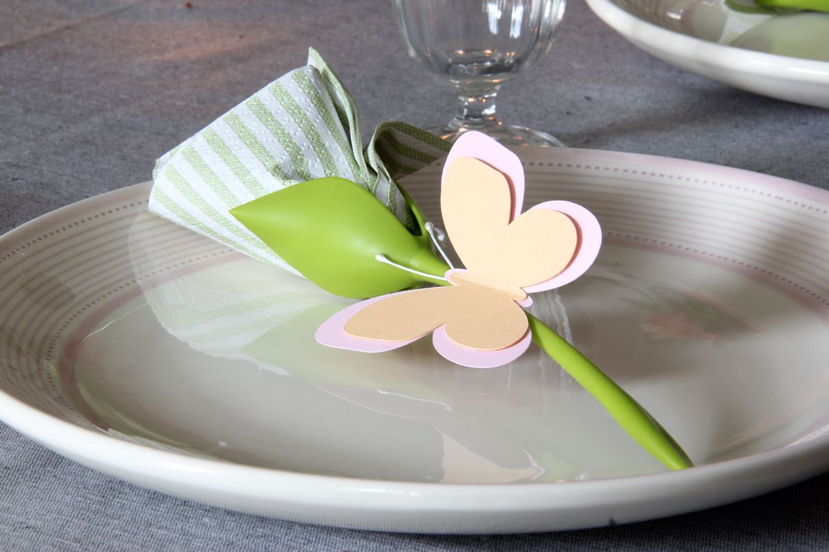 Enroulez les serviettes de couleurs dans le porte-serviette. Pour ce faire, j’ai enlevé une épaisseur de la serviette – c’est plus facile du coup. Découpez un papillon de deux tailles différentes et collez-les ensuite en les superposant. Collez ensuite le papillon sur le porte-serviette ou posez-le dessus. Et voilà, la déco serviette unique pour le printemps est prête.