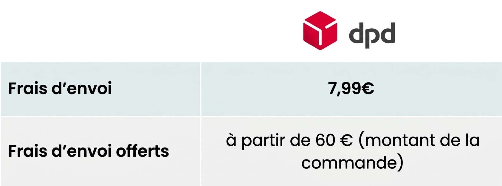 Le montant des frais de port est de 7,99 € pour une livraison avec notre partenaire DPD. Si le montant de la commande est supérieur à 60 €, les frais sont offerts.