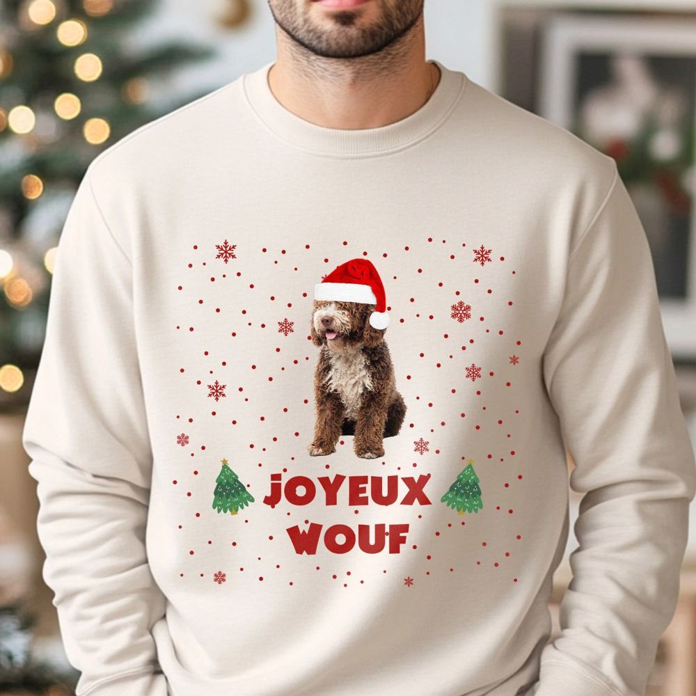 Ce pull de Noël est idéal pour ceux et celles qui souhaitent inclure leur fidèle compagnon dans les festivités ! Avec une photo de votre animal, accompagné d’un bonnet de Noël et du texte de votre choix, ce pull devient une pièce unique et joyeuse. Choisissez parmi différentes couleurs pour le personnaliser à votre goût. Que ce soit un doux message, une phrase amusante ou le nom de votre animal adoré, ce pull ajoutera une ambiance de fête à votre tenue.